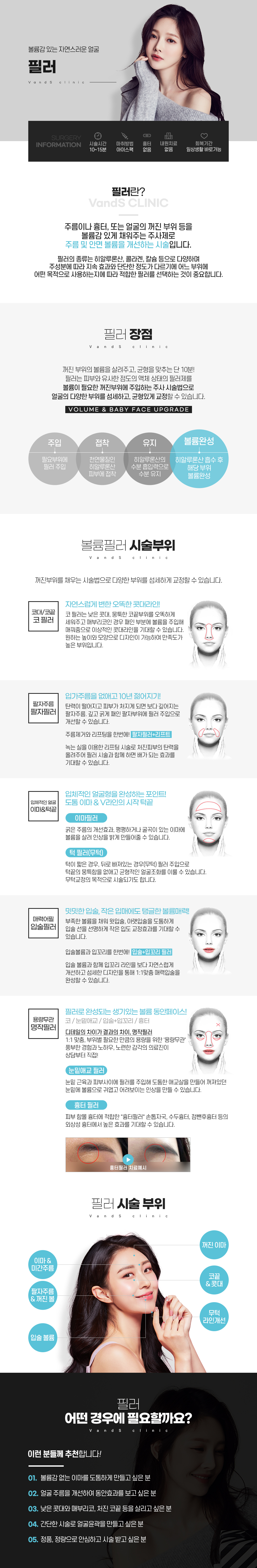 얼굴의 볼륨과 주름개선이 필요한 부위에 체내 흡수가 용이한 히알루론산 성분의 필러를 주입하여 볼륨 형성과 주름을 개선하는 시술입니다. 주로 이마/코/볼/팔자/눈 밑, 턱 끝 등에 시술하여 보다 어려보이는 효과를 기대할 수 있습니다.